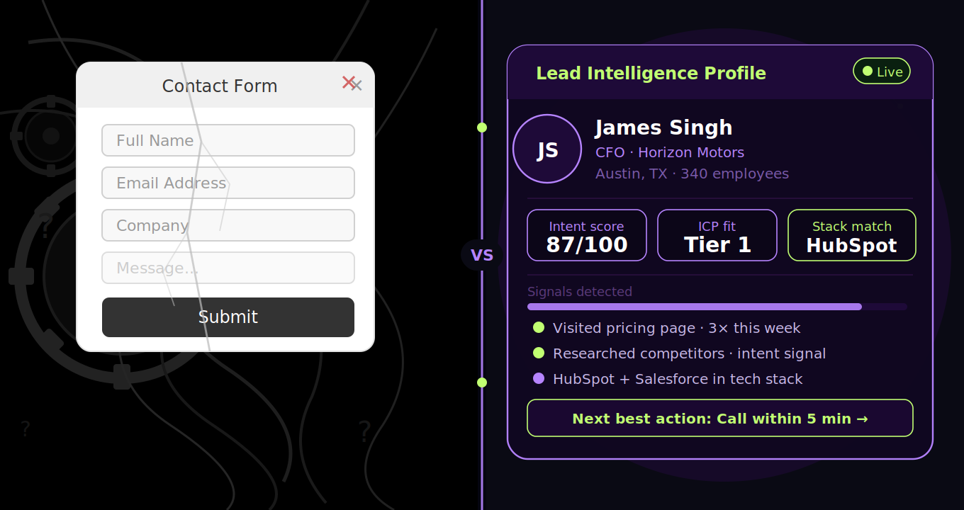 What does most software store when a lead submits a form? A name. An email. Maybe a company. That is not intelligence. That is a business card — and a business card without context is just noise.